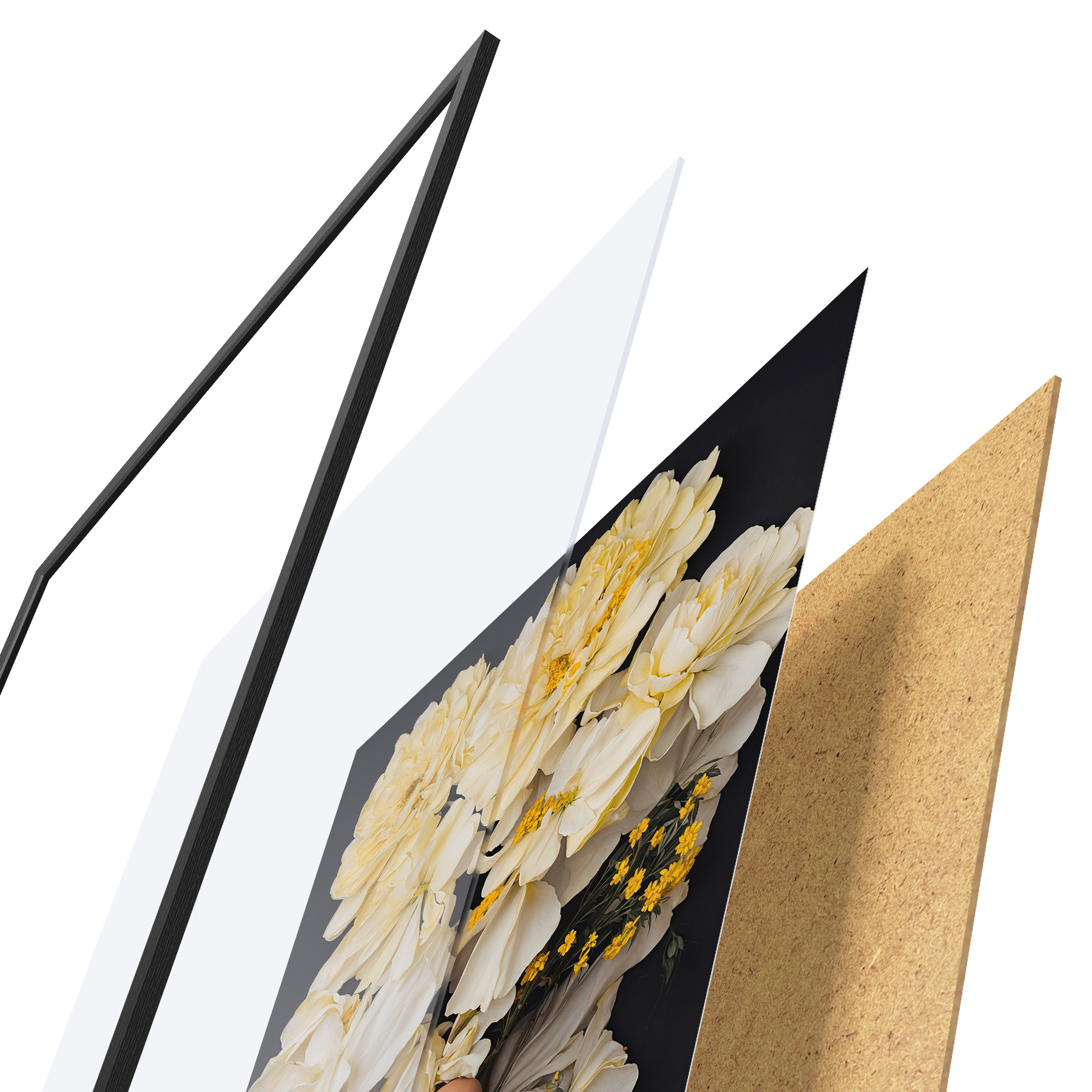 Plakāts sastāv no rāmja, pleksstikla, iespiestā attēla un skaidu plātnes pamatnes. Plakātu var uzreiz piekarināt pie sienas, pateicoties aizmugurē esošajiem stiprinājumiem.