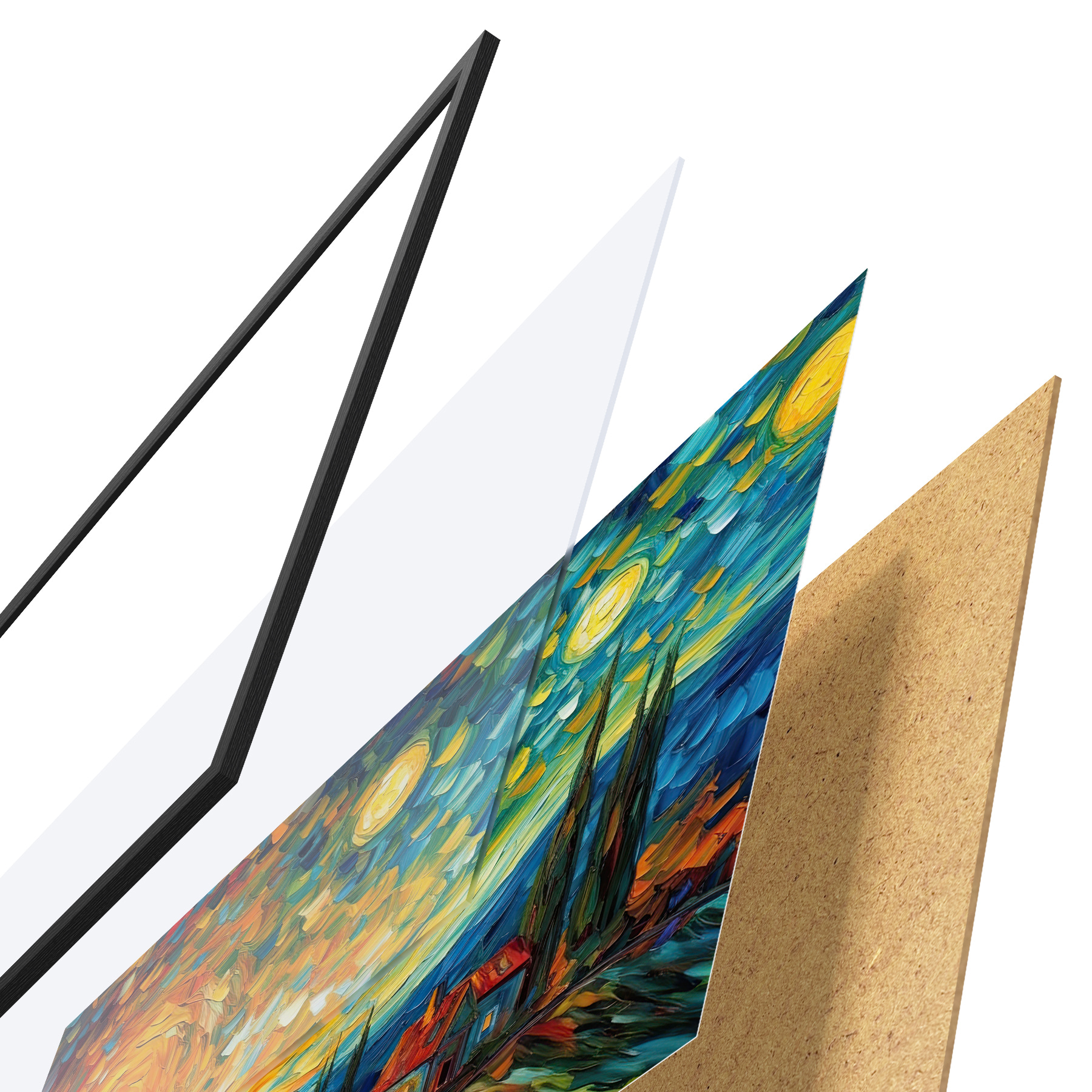 Plakāts sastāv no rāmja, pleksstikla, iespiestā attēla un skaidu plātnes pamatnes. Plakātu var uzreiz piekarināt pie sienas, pateicoties aizmugurē esošajiem stiprinājumiem.