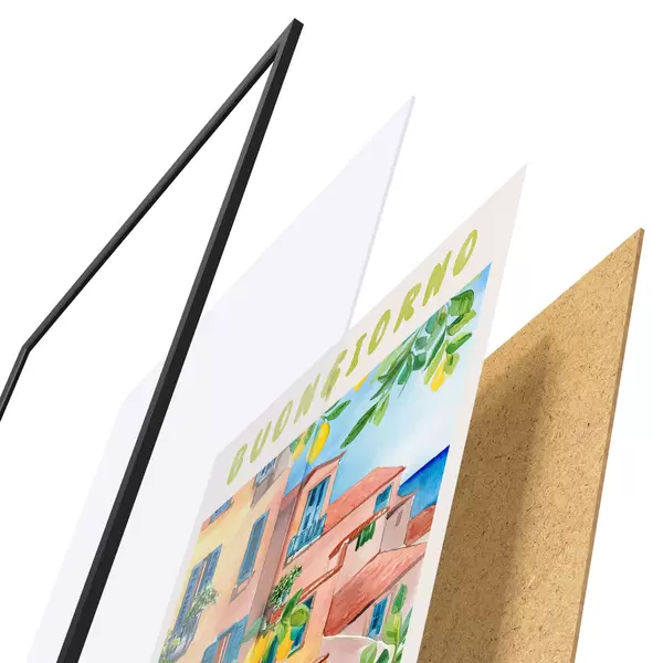 Plakāts sastāv no rāmja, pleksstikla, iespiestā attēla un skaidu plātnes pamatnes. Plakātu var uzreiz piekarināt pie sienas, pateicoties aizmugurē esošajiem stiprinājumiem.