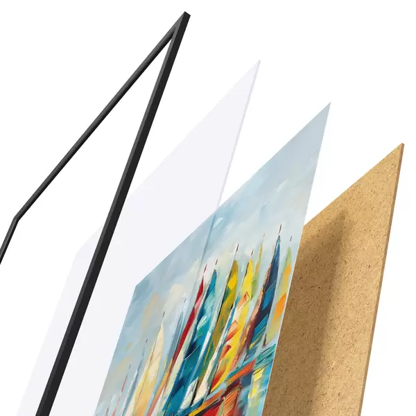 Plakāts sastāv no rāmja, pleksstikla, iespiestā attēla un skaidu plātnes pamatnes. Plakātu var uzreiz piekarināt pie sienas, pateicoties aizmugurē esošajiem stiprinājumiem.