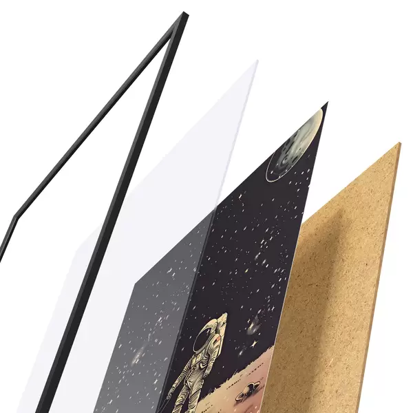 Plakāts sastāv no rāmja, pleksstikla, iespiestā attēla un skaidu plātnes pamatnes. Plakātu var uzreiz piekarināt pie sienas, pateicoties aizmugurē esošajiem stiprinājumiem.