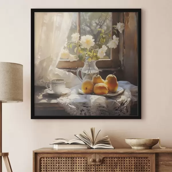 SākumlapaPlakātu katalogsPlakāti ziediPlakāts Lauku klusā daba ar dzelteniem nogatavojušies bumbieri uz šķīvja uz galda pie loga, baltas rozes stikla krūzī, balti mežģīņu aizkari Nr f39129
