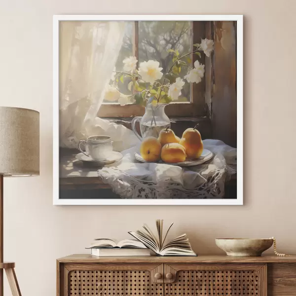 SākumlapaPlakātu katalogsPlakāti ziediPlakāts Lauku klusā daba ar dzelteniem nogatavojušies bumbieri uz šķīvja uz galda pie loga, baltas rozes stikla krūzī, balti mežģīņu aizkari Nr f39129