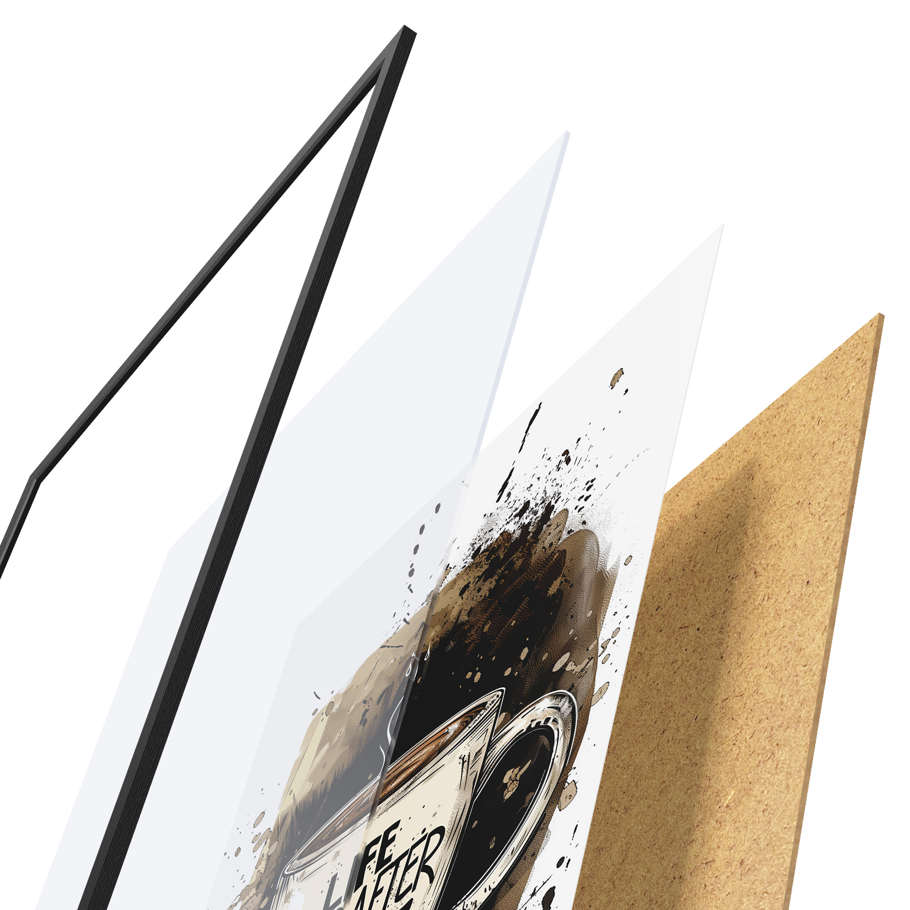 Plakāts sastāv no rāmja, pleksstikla, iespiestā attēla un skaidu plātnes pamatnes. Plakātu var uzreiz piekarināt pie sienas, pateicoties aizmugurē esošajiem stiprinājumiem.
