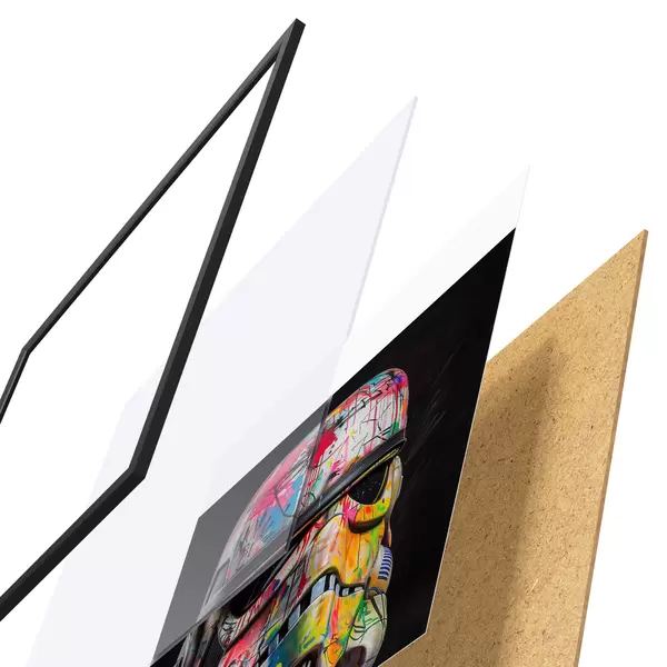 Plakāts sastāv no rāmja, pleksstikla, iespiestā attēla un skaidu plātnes pamatnes. Plakātu var uzreiz piekarināt pie sienas, pateicoties aizmugurē esošajiem stiprinājumiem.