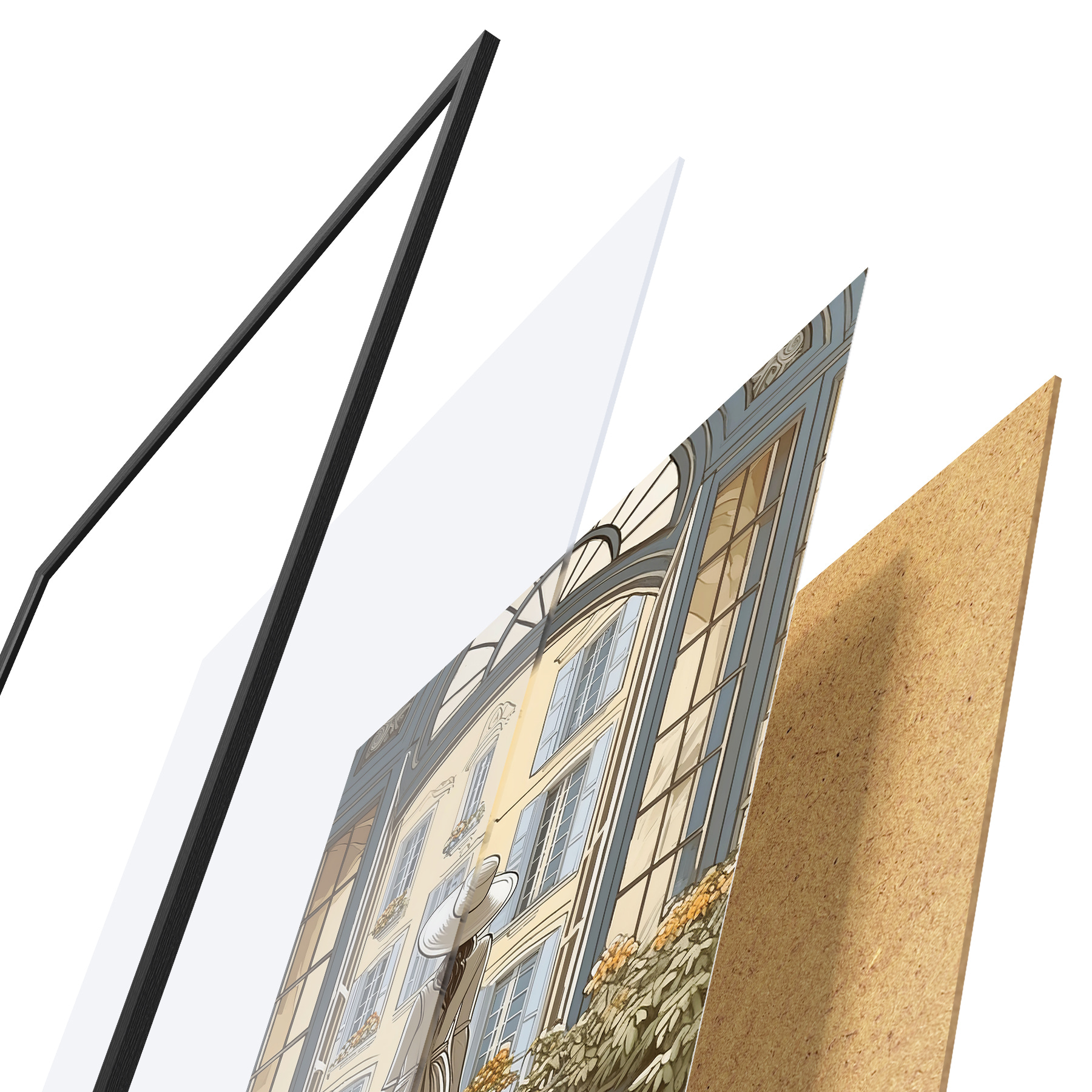 Plakāts sastāv no rāmja, pleksstikla, iespiestā attēla un skaidu plātnes pamatnes. Plakātu var uzreiz piekarināt pie sienas, pateicoties aizmugurē esošajiem stiprinājumiem.