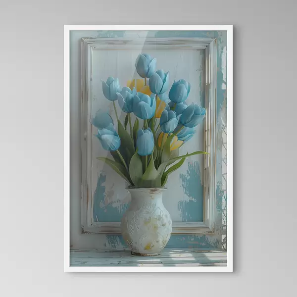 SākumlapaPlakātu katalogsPlakāti ziediPlakāts Zilas un dzeltenas tulpes 3D formātā: elegants sienas attēls ar baltu rāmi, balts un gaiši zils fons un iegravēta vāze Nr f39636