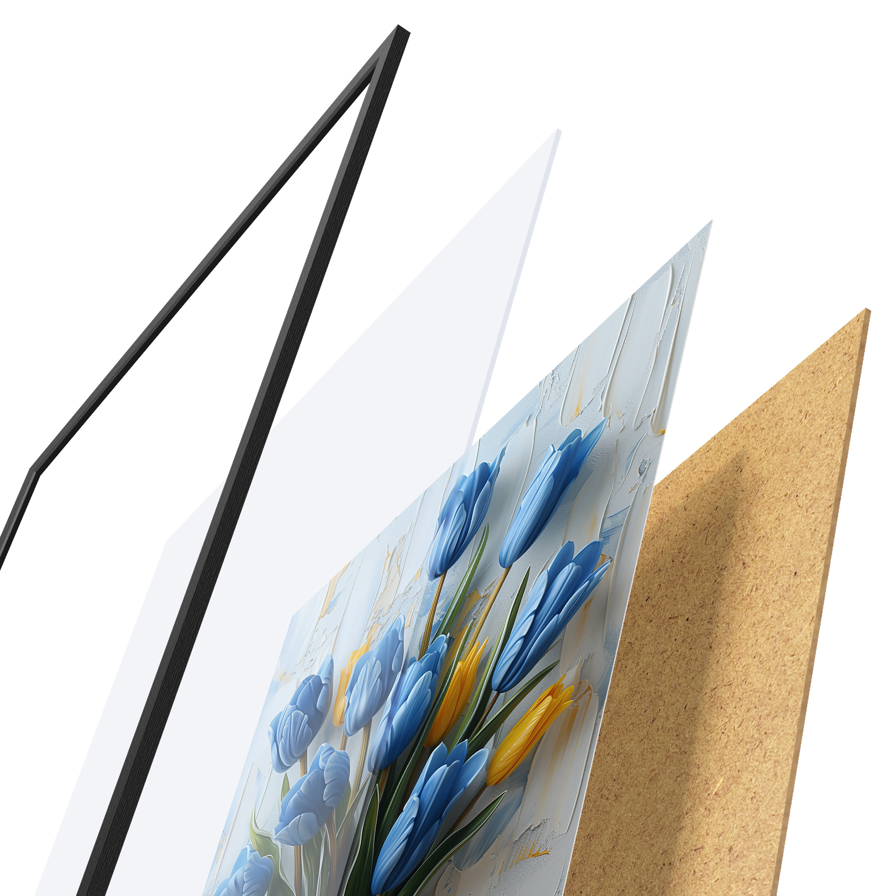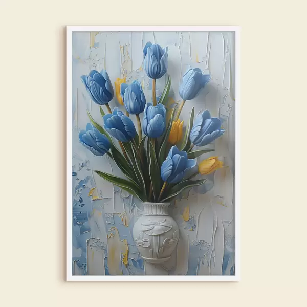 SākumlapaPlakātu katalogsPlakāti ziediPlakāts Zilas un dzeltenas tulpes 3D formātā: elegants eļļas krāsas sienas attēls ar baltu un gaiši zilu fonu un iegravēta vāze Nr f39637