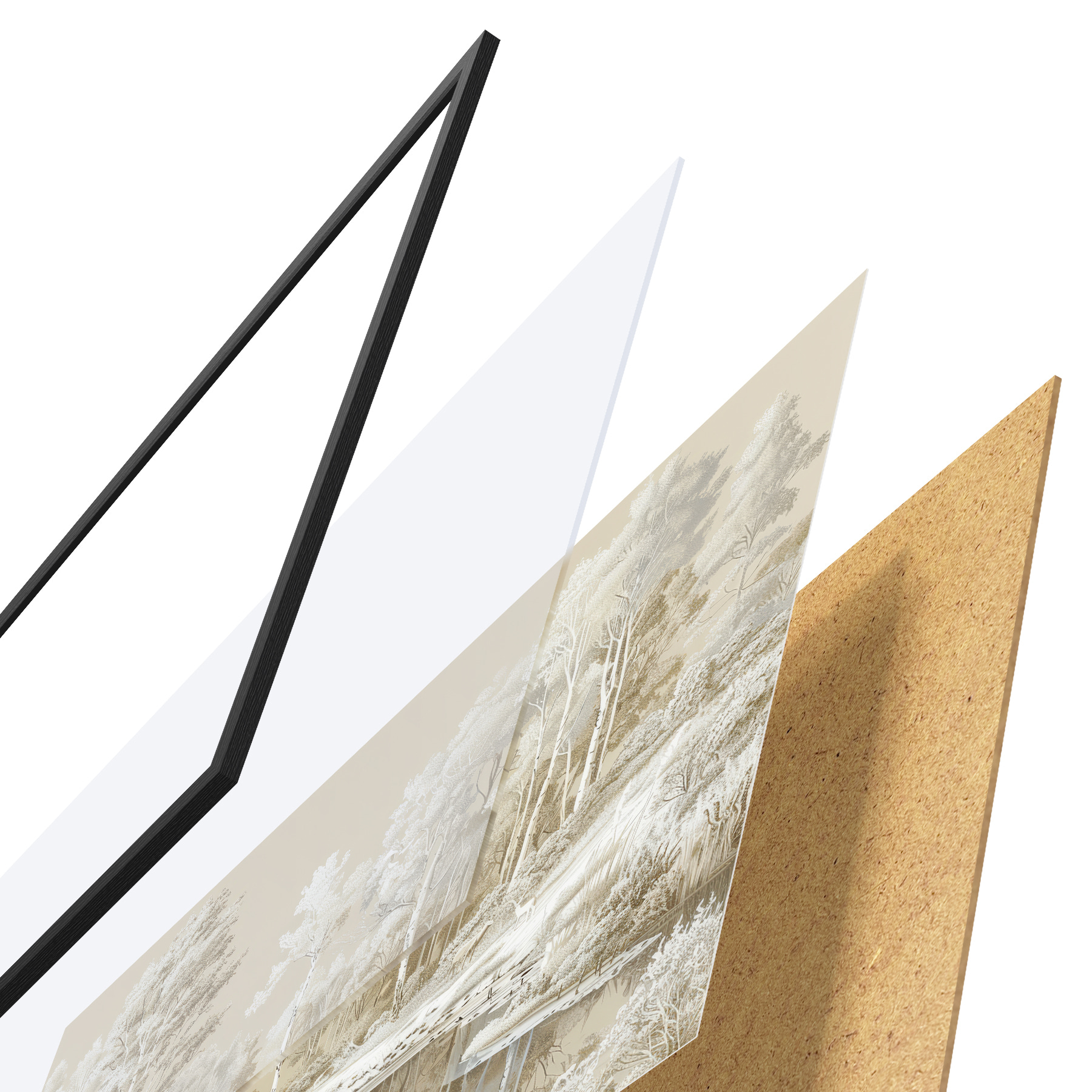 Plakāts sastāv no rāmja, pleksstikla, iespiestā attēla un skaidu plātnes pamatnes. Plakātu var uzreiz piekarināt pie sienas, pateicoties aizmugurē esošajiem stiprinājumiem.