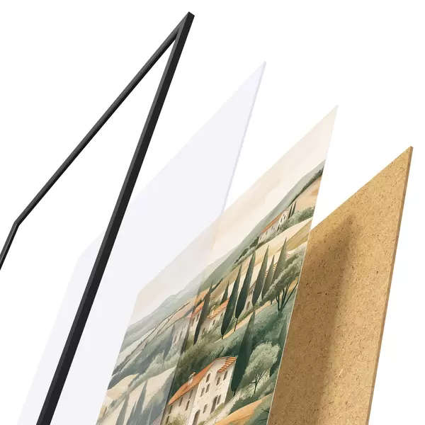Plakāts sastāv no rāmja, pleksstikla, iespiestā attēla un skaidu plātnes pamatnes. Plakātu var uzreiz piekarināt pie sienas, pateicoties aizmugurē esošajiem stiprinājumiem.