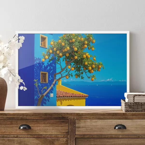 SākumlapaPlakātu katalogsPlakāti dabaPlakāts Apelsīnu koks ar gataviem augļiem, kas aug uz ēkas ar zilu sienu un dakstiņu jumtu ar skatu uz okeānu Nr f40159