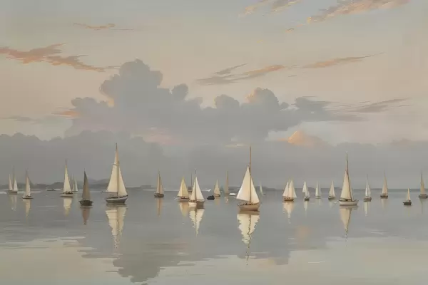 Plakāts Baltu buru laivu flote uz mierīga, atstarojoša ūdenstilpnes saulrieta laikā ar mākoņainām debesīm fonā Nr f40615