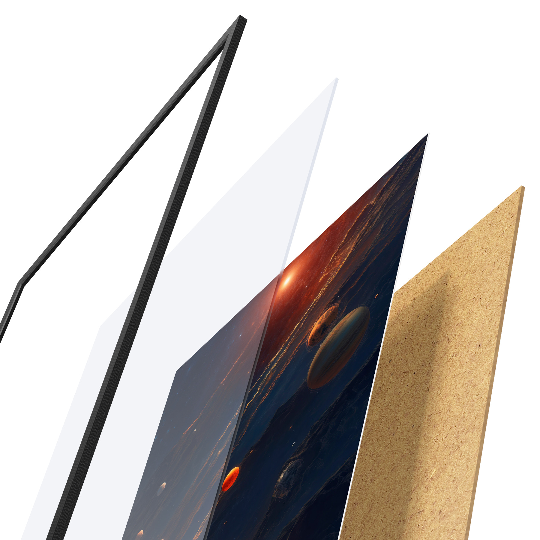 Plakāts sastāv no rāmja, pleksstikla, iespiestā attēla un skaidu plātnes pamatnes. Plakātu var uzreiz piekarināt pie sienas, pateicoties aizmugurē esošajiem stiprinājumiem.