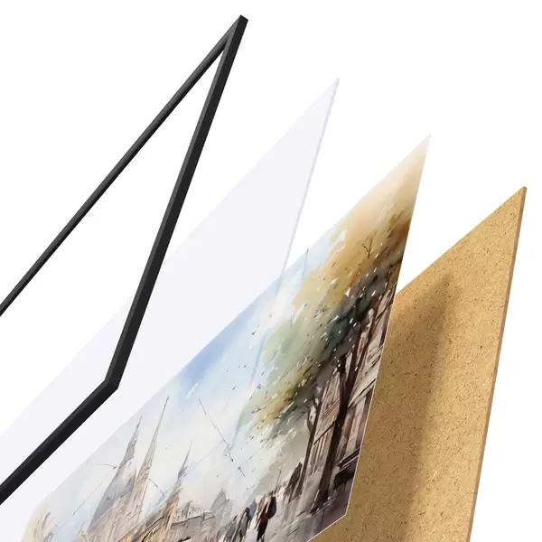 Plakāts sastāv no rāmja, pleksstikla, iespiestā attēla un skaidu plātnes pamatnes. Plakātu var uzreiz piekarināt pie sienas, pateicoties aizmugurē esošajiem stiprinājumiem.