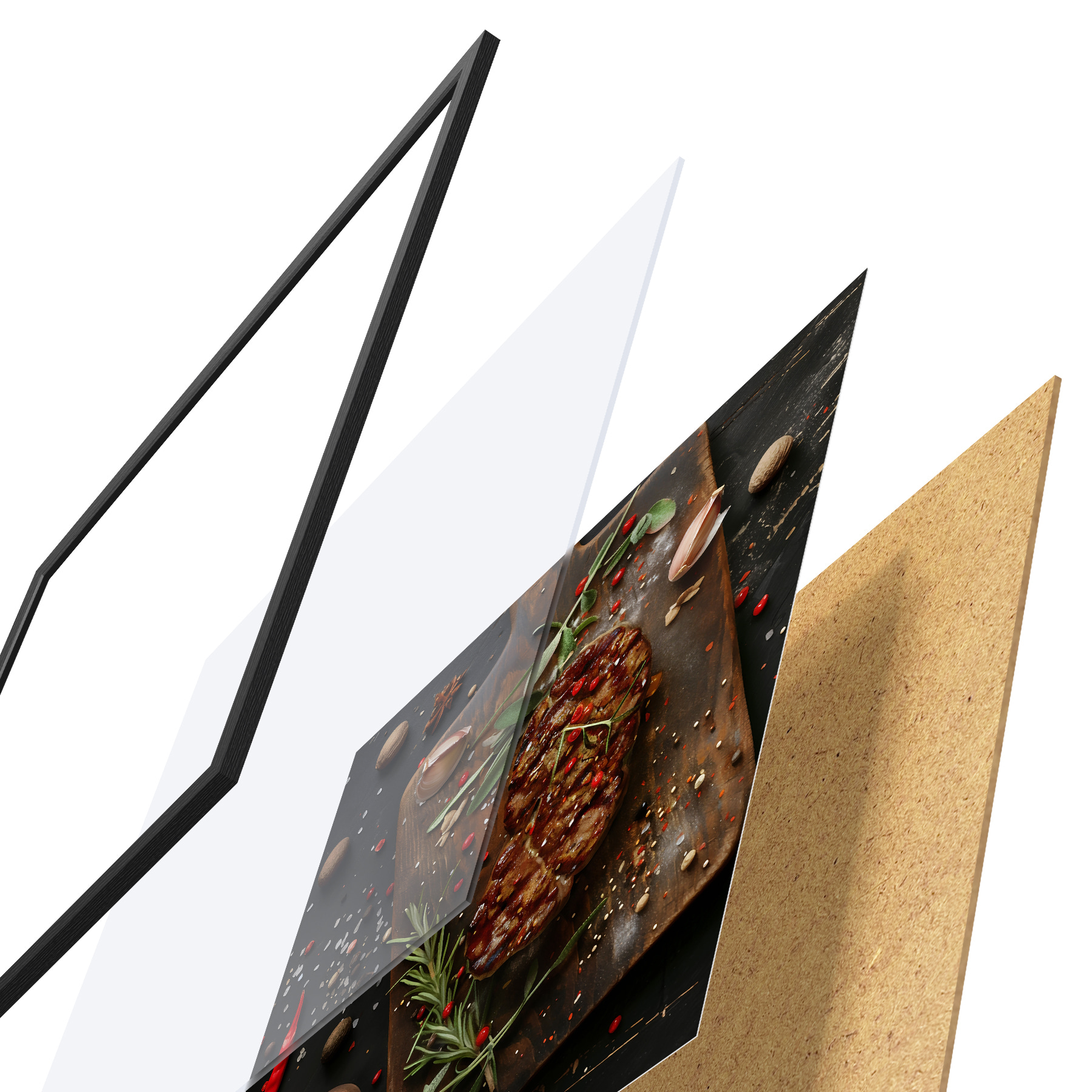 Plakāts sastāv no rāmja, pleksstikla, iespiestā attēla un skaidu plātnes pamatnes. Plakātu var uzreiz piekarināt pie sienas, pateicoties aizmugurē esošajiem stiprinājumiem.