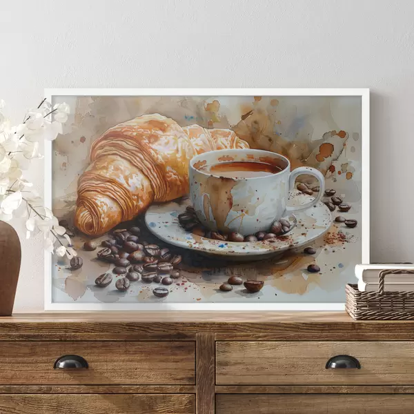 Plakāts Kruasāns, rīts, kruasāns un kafijas tasīte, akvarelis f40782