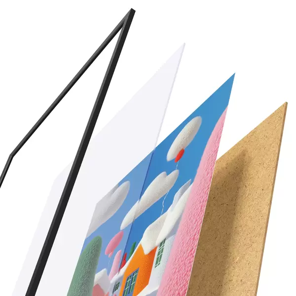 Plakāts sastāv no rāmja, pleksstikla, iespiestā attēla un skaidu plātnes pamatnes. Plakātu var uzreiz piekarināt pie sienas, pateicoties aizmugurē esošajiem stiprinājumiem.