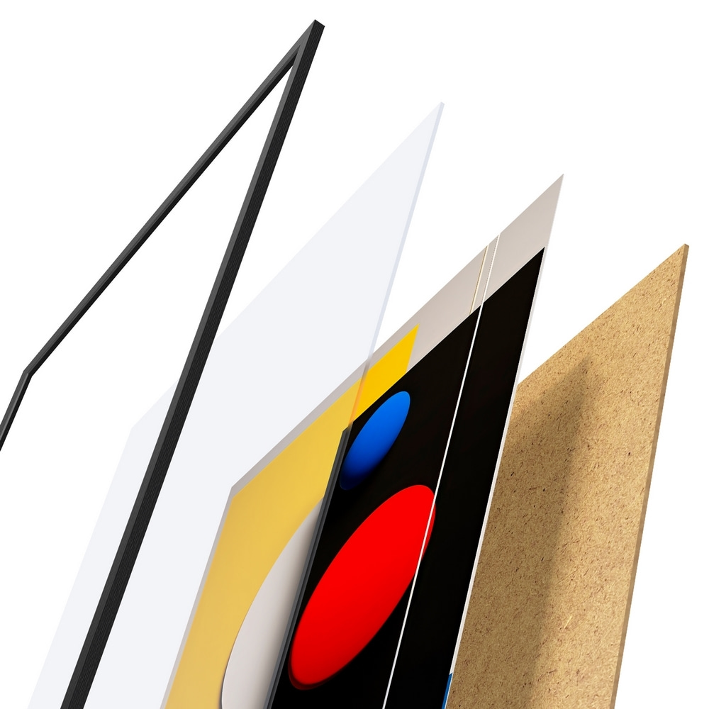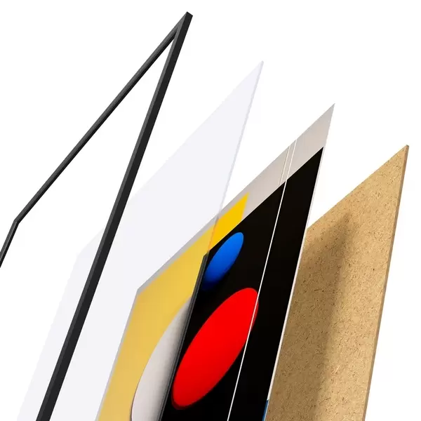 Plakāts sastāv no rāmja, pleksstikla, iespiestā attēla un skaidu plātnes pamatnes. Plakātu var uzreiz piekarināt pie sienas, pateicoties aizmugurē esošajiem stiprinājumiem.