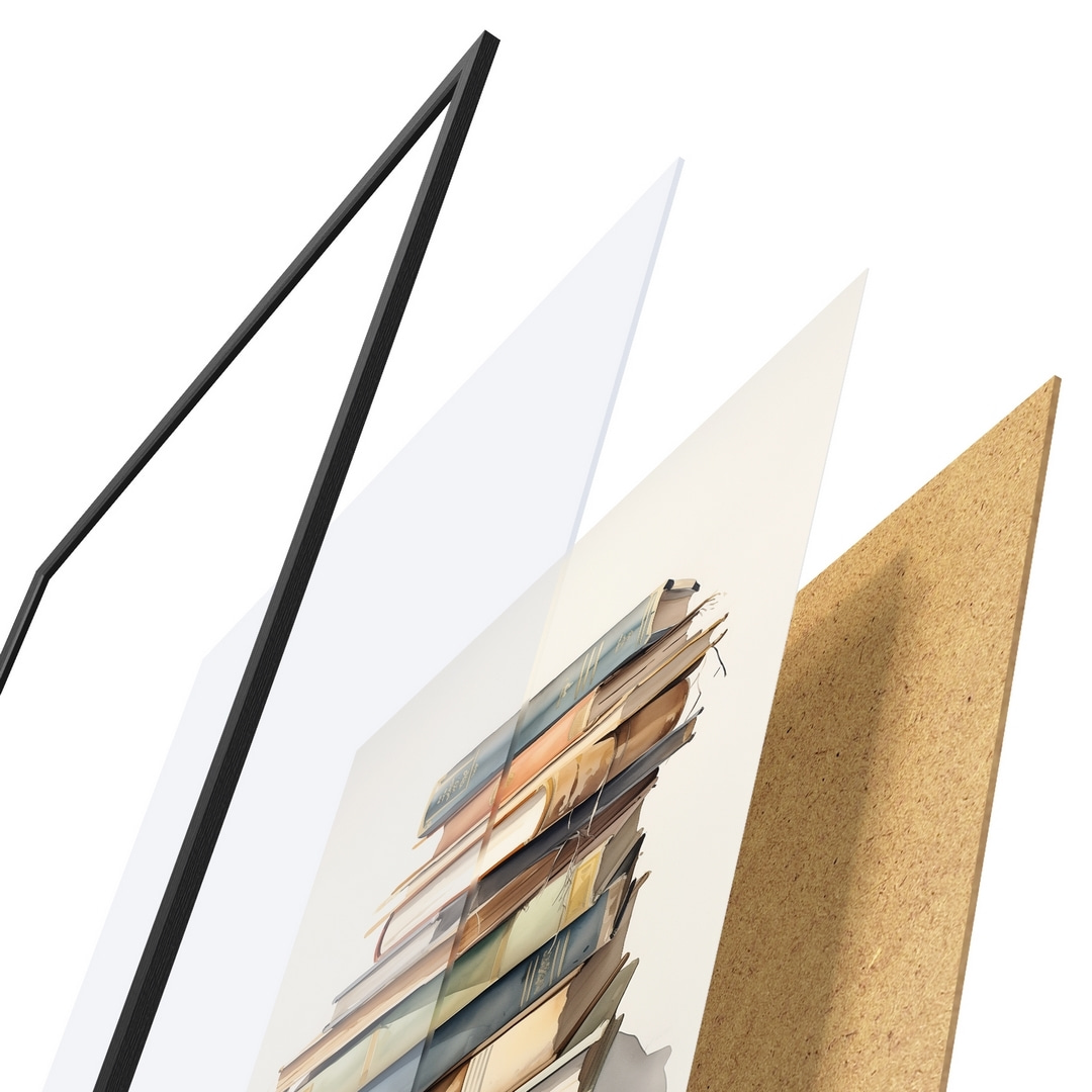 Plakāts sastāv no rāmja, pleksstikla, iespiestā attēla un skaidu plātnes pamatnes. Plakātu var uzreiz piekarināt pie sienas, pateicoties aizmugurē esošajiem stiprinājumiem.