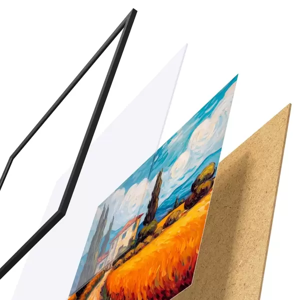 Plakāts sastāv no rāmja, pleksstikla, iespiestā attēla un skaidu plātnes pamatnes. Plakātu var uzreiz piekarināt pie sienas, pateicoties aizmugurē esošajiem stiprinājumiem.