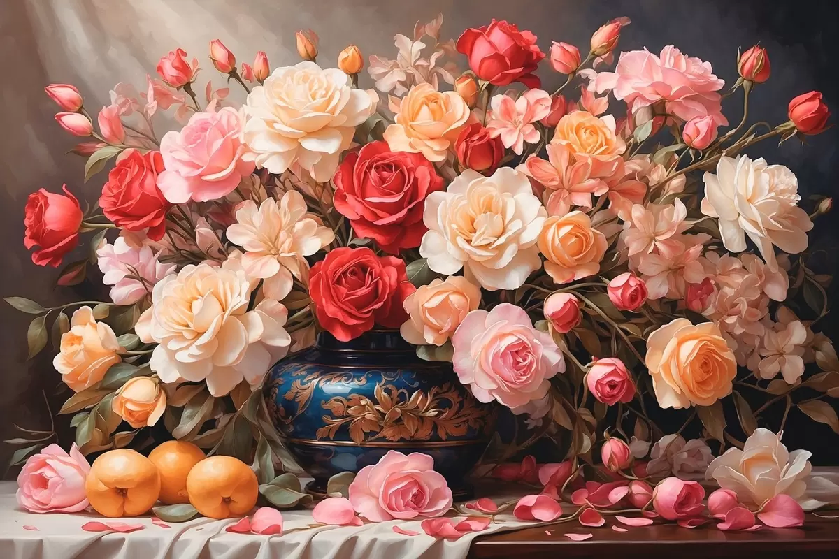 Plakāts Puķu pušķis zilā tilpuma vāzē Nr f41518