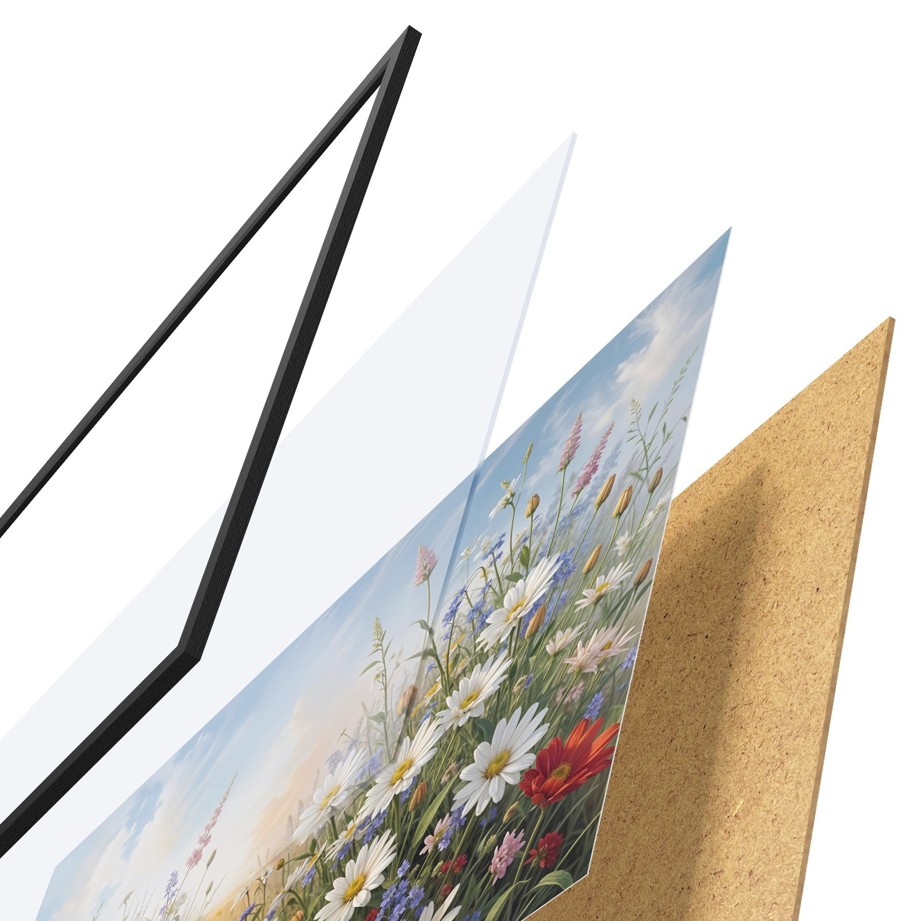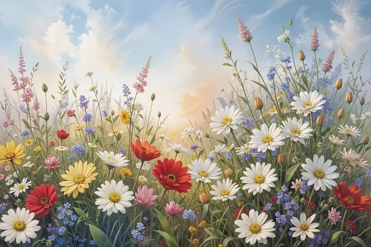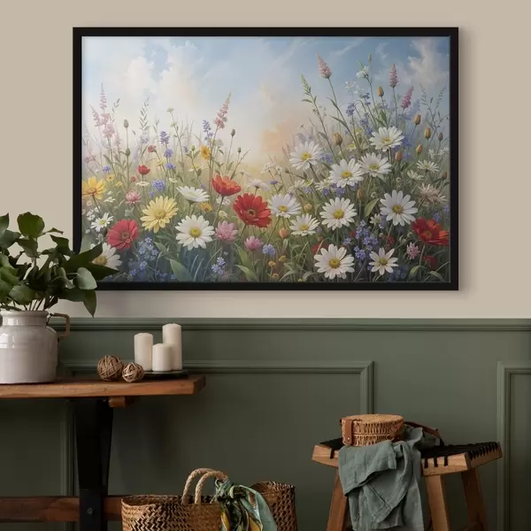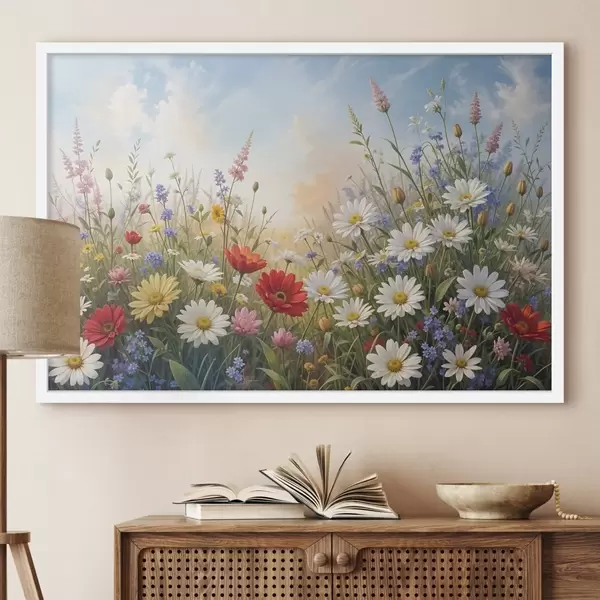 SākumlapaPlakātu katalogsPlakāti ziediPlakāts Krāsainu savvaļas ziedu lauks, tostarp margrietiņas, magones un citi ziedoši augi uz zilu debesu fona Nr f41725