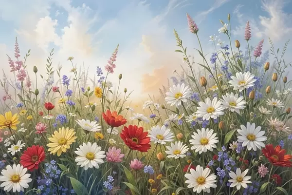 SākumlapaPlakātu katalogsPlakāti ziediPlakāts Krāsainu savvaļas ziedu lauks, tostarp margrietiņas, magones un citi ziedoši augi uz zilu debesu fona Nr f41725