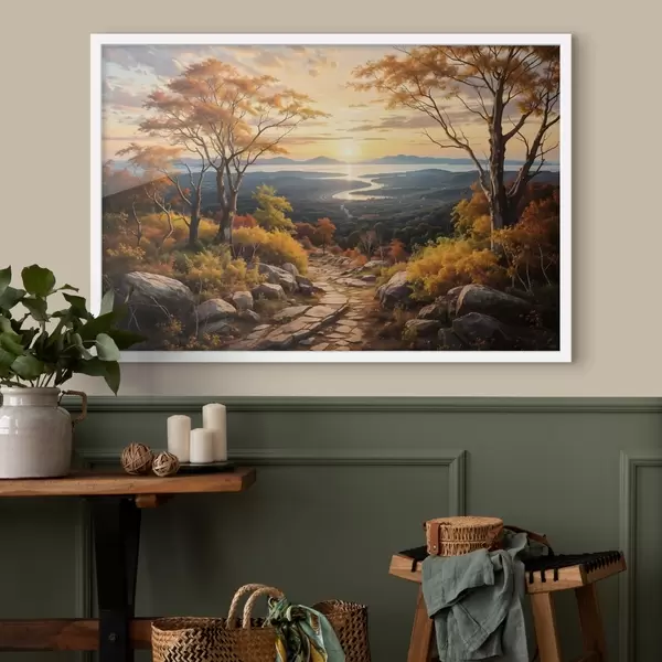 Plakāts Ainava ar līkumainu zemes ceļu, kas ved cauri rudenīgi iekrāsotu koku mežam un saulrieta debesīm Nr f41732