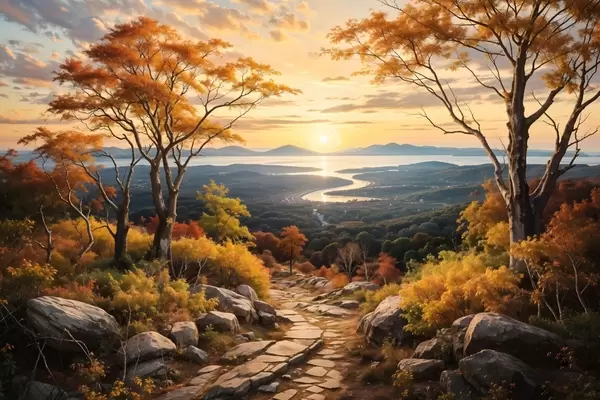 SākumlapaPlakātu katalogsPlakāti dabaPlakāts Ainava ar līkumainu zemes ceļu, kas ved cauri rudenīgi iekrāsotu koku mežam un saulrieta debesīm Nr f41732