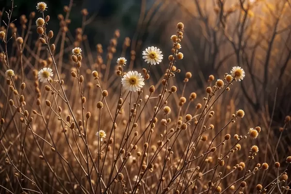 Plakāts Baltas margrietiņas sausas zāles un stiebru laukā, siltā vakara saules gaismā Nr f41735