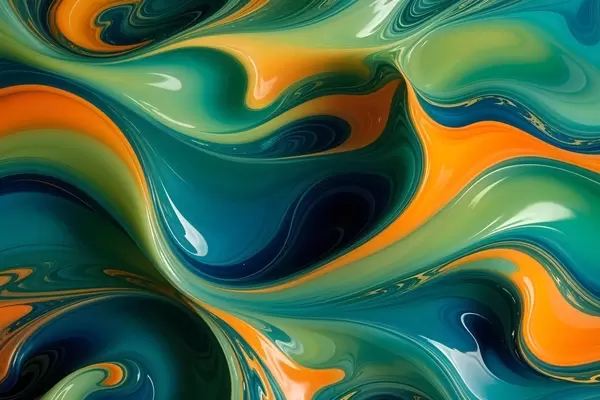Plakāts Virpuļojoši abstrakti raksti zaļos, zilos un oranžos toņos ar plūstošām, organiskām formām un faktūrām f41737