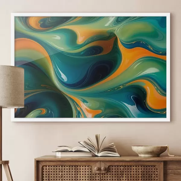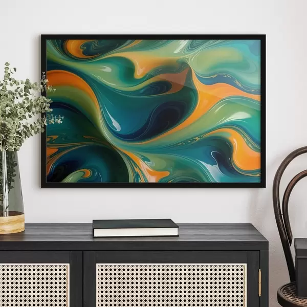 Plakāts Virpuļojoši abstrakti raksti zaļos, zilos un oranžos toņos ar plūstošām, organiskām formām un faktūrām Nr f41737