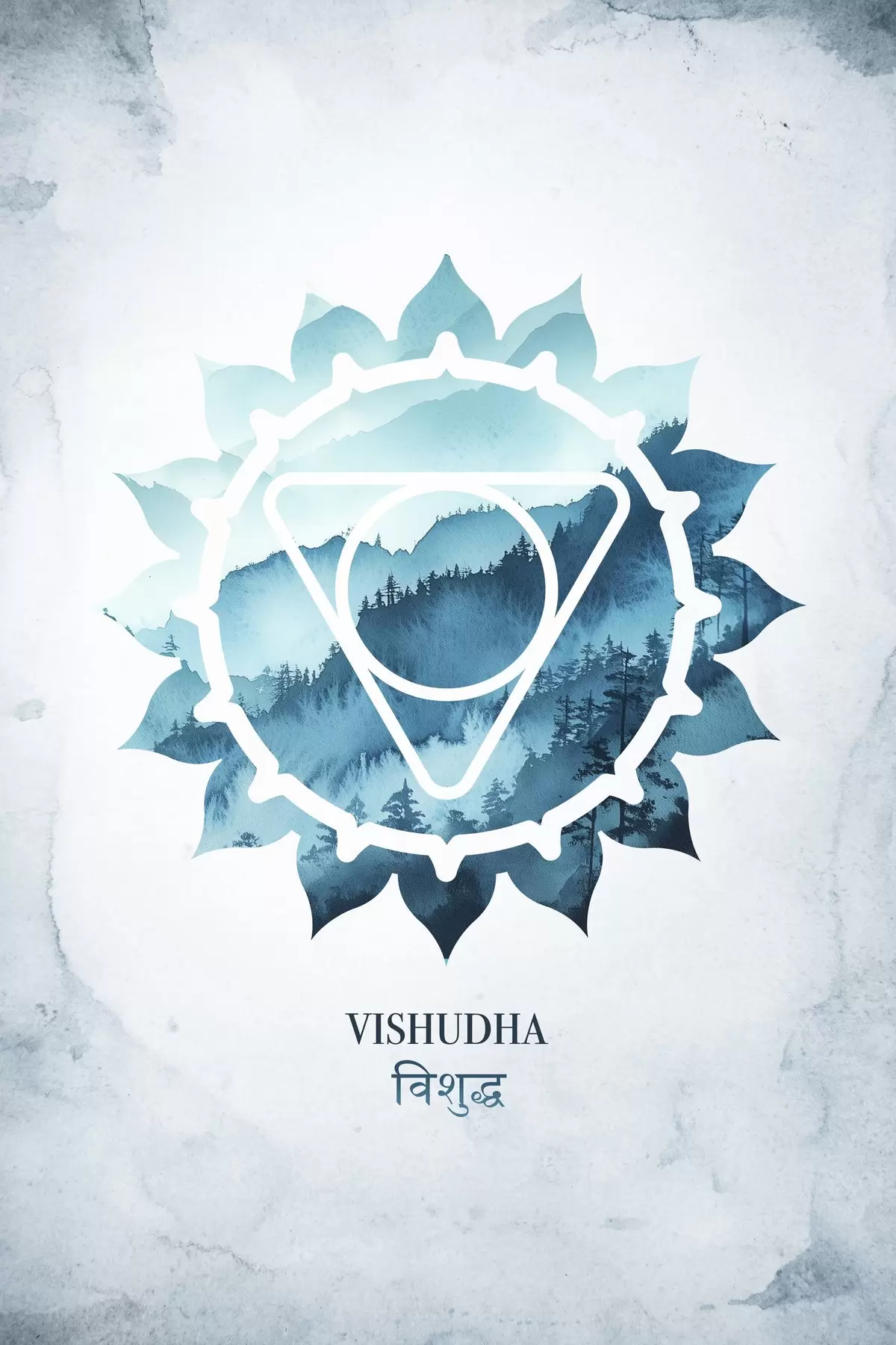 Plakāts Višuddha čakra, zilā čakra, ezoterika, meditācija, budisms, akvareļu stila kalni Nr f41884