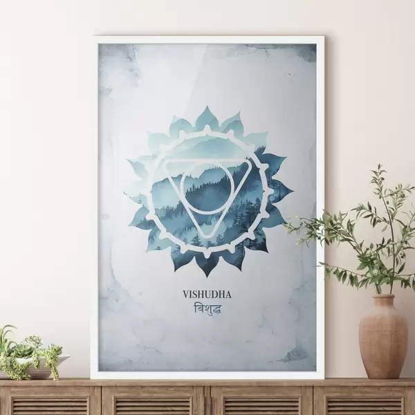 Plakāts Višuddha čakra, zilā čakra, ezoterika, meditācija, budisms, akvareļu stila kalni f41884