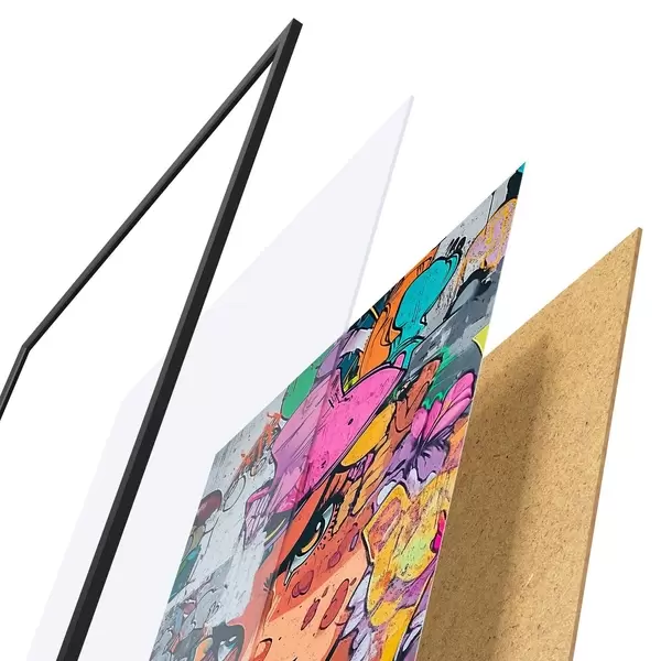 Plakāts sastāv no rāmja, pleksstikla, iespiestā attēla un skaidu plātnes pamatnes. Plakātu var uzreiz piekarināt pie sienas, pateicoties aizmugurē esošajiem stiprinājumiem.