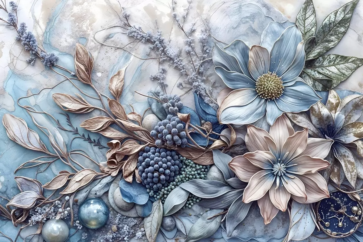 Plakāts Detalizēts teksturēts abstrakts sulīgs ziedu komplekts ar lieliem, spilgtiem ziliem un rozā ziediem, ogām un citiem botāniskajiem elementiem Nr f42210