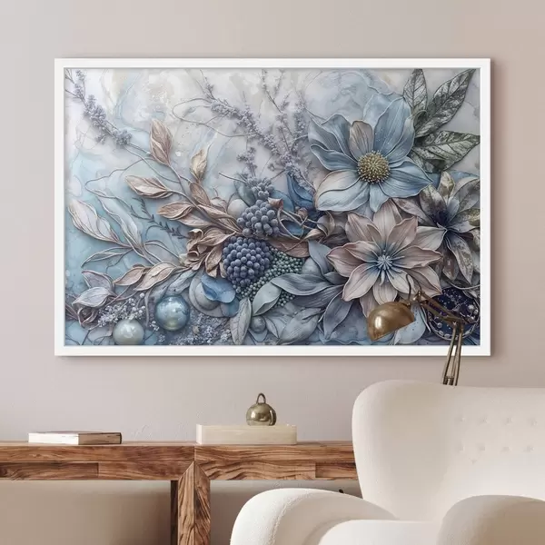 Plakāts Detalizēts teksturēts abstrakts sulīgs ziedu komplekts ar lieliem, spilgtiem ziliem un rozā ziediem, ogām un citiem botāniskajiem elementiem Nr f42210