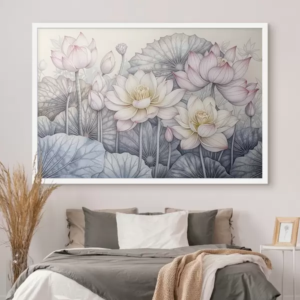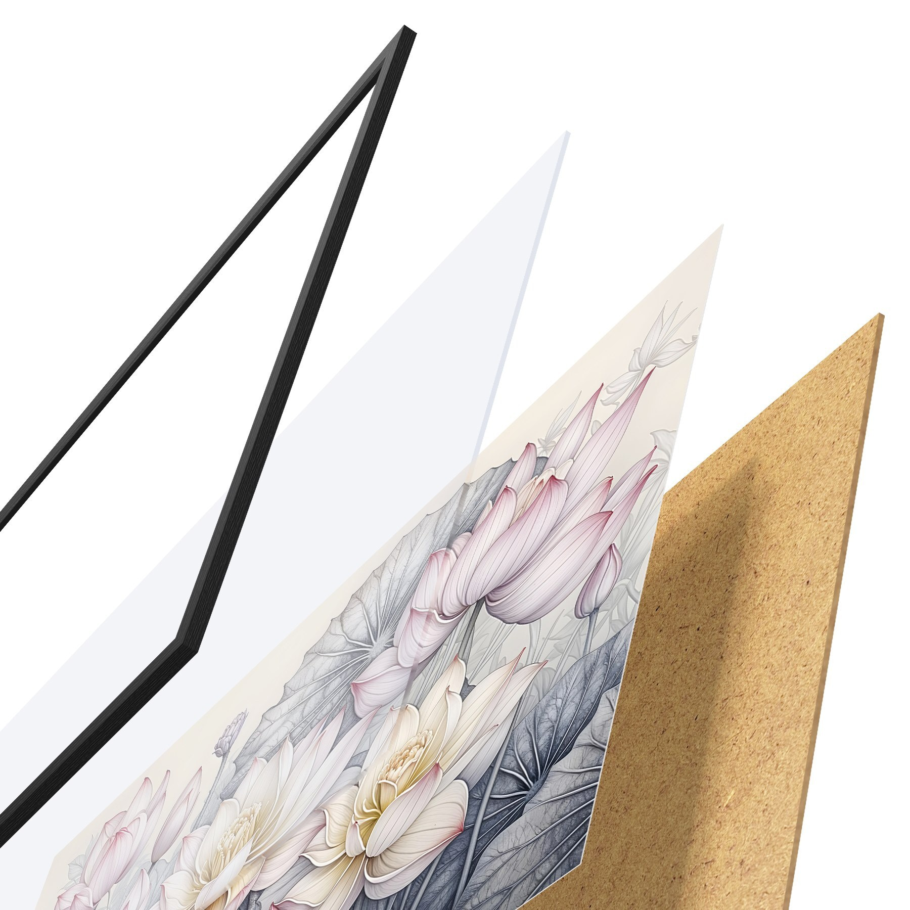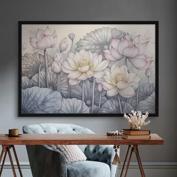 SākumlapaPlakātu katalogsPlakāti ziediPlakāts Lieli rozā un balti lotosa ziedi ar zaļām lapām un kātiņiem uz gaiša fona ar detalizētiem ziedlapiņām un centriem Nr f42221