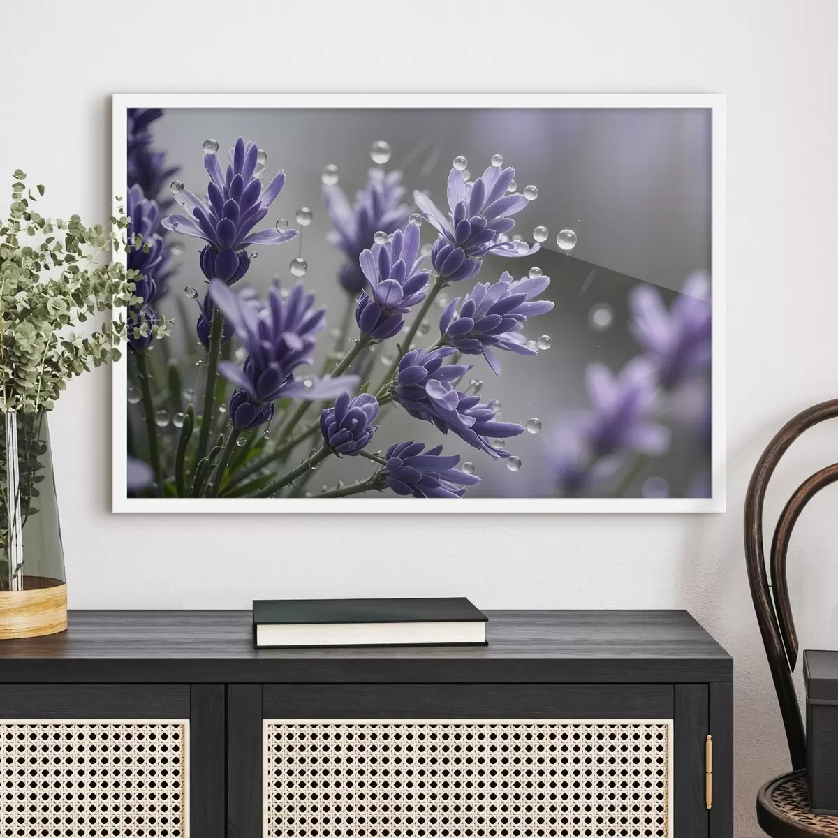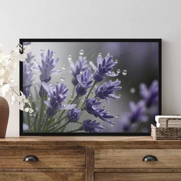 Plakāts Violeti lavandas ziedi ar ūdens pilieniem uz ziedlapiņām uz neskaidra fona f42229