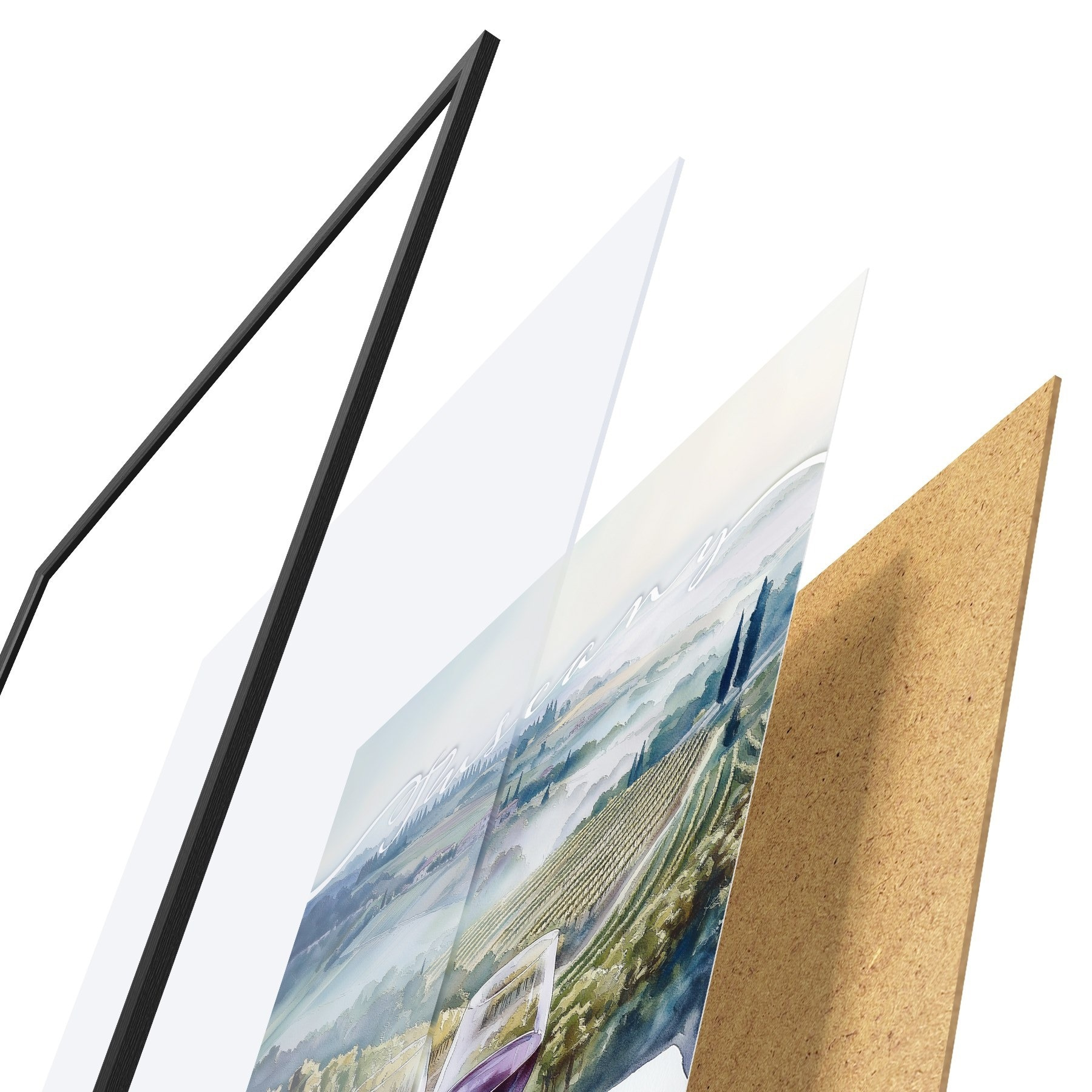Plakāts sastāv no rāmja, pleksstikla, iespiestā attēla un skaidu plātnes pamatnes. Plakātu var uzreiz piekarināt pie sienas, pateicoties aizmugurē esošajiem stiprinājumiem.