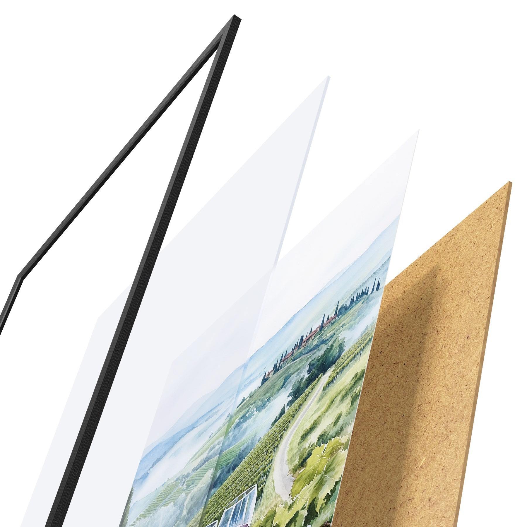 Plakāts sastāv no rāmja, pleksstikla, iespiestā attēla un skaidu plātnes pamatnes. Plakātu var uzreiz piekarināt pie sienas, pateicoties aizmugurē esošajiem stiprinājumiem.