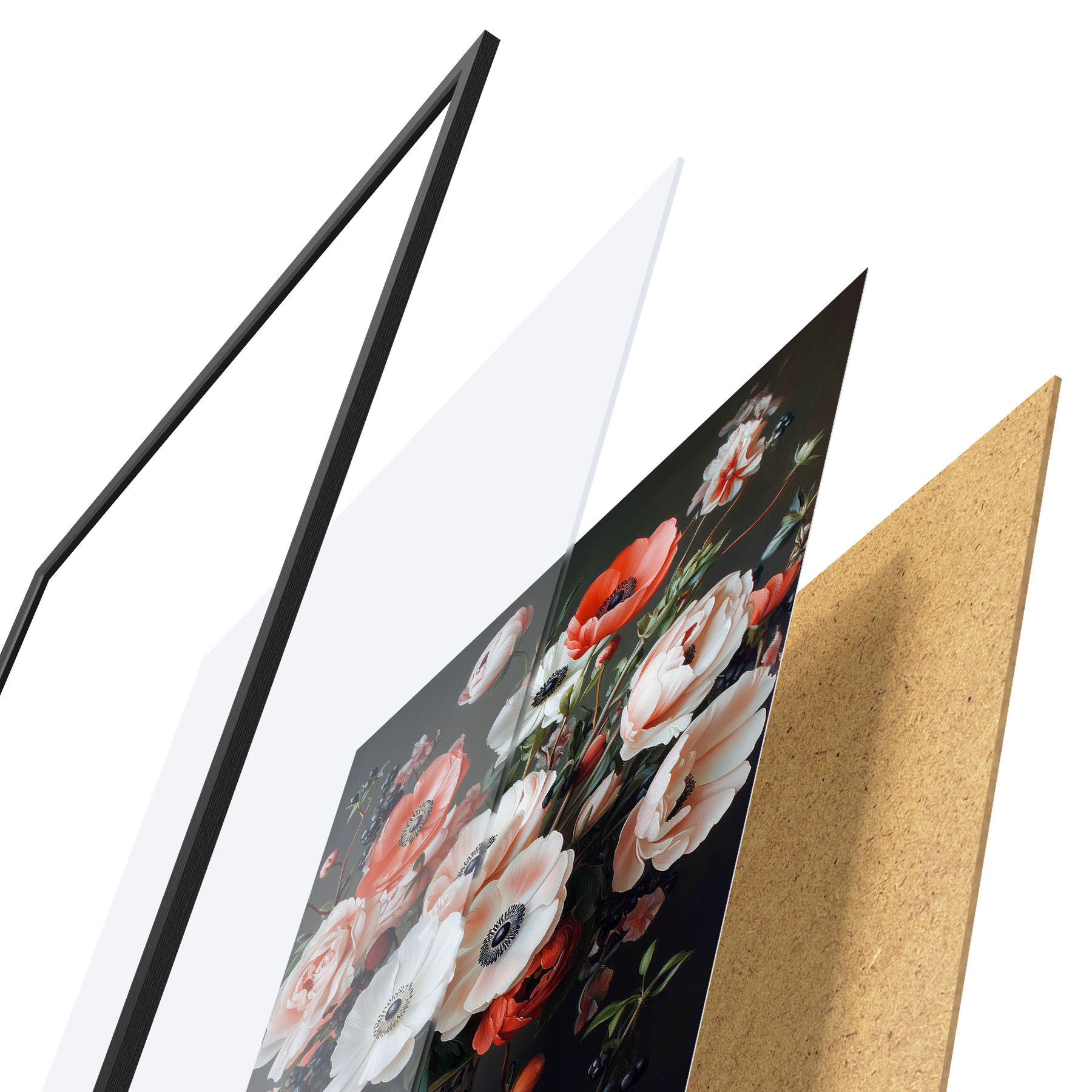 Plakāts sastāv no rāmja, pleksstikla, iespiestā attēla un skaidu plātnes pamatnes. Plakātu var uzreiz piekarināt pie sienas, pateicoties aizmugurē esošajiem stiprinājumiem.