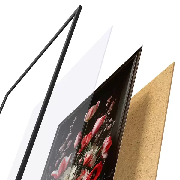 Plakāts sastāv no rāmja, pleksstikla, iespiestā attēla un skaidu plātnes pamatnes. Plakātu var uzreiz piekarināt pie sienas, pateicoties aizmugurē esošajiem stiprinājumiem.