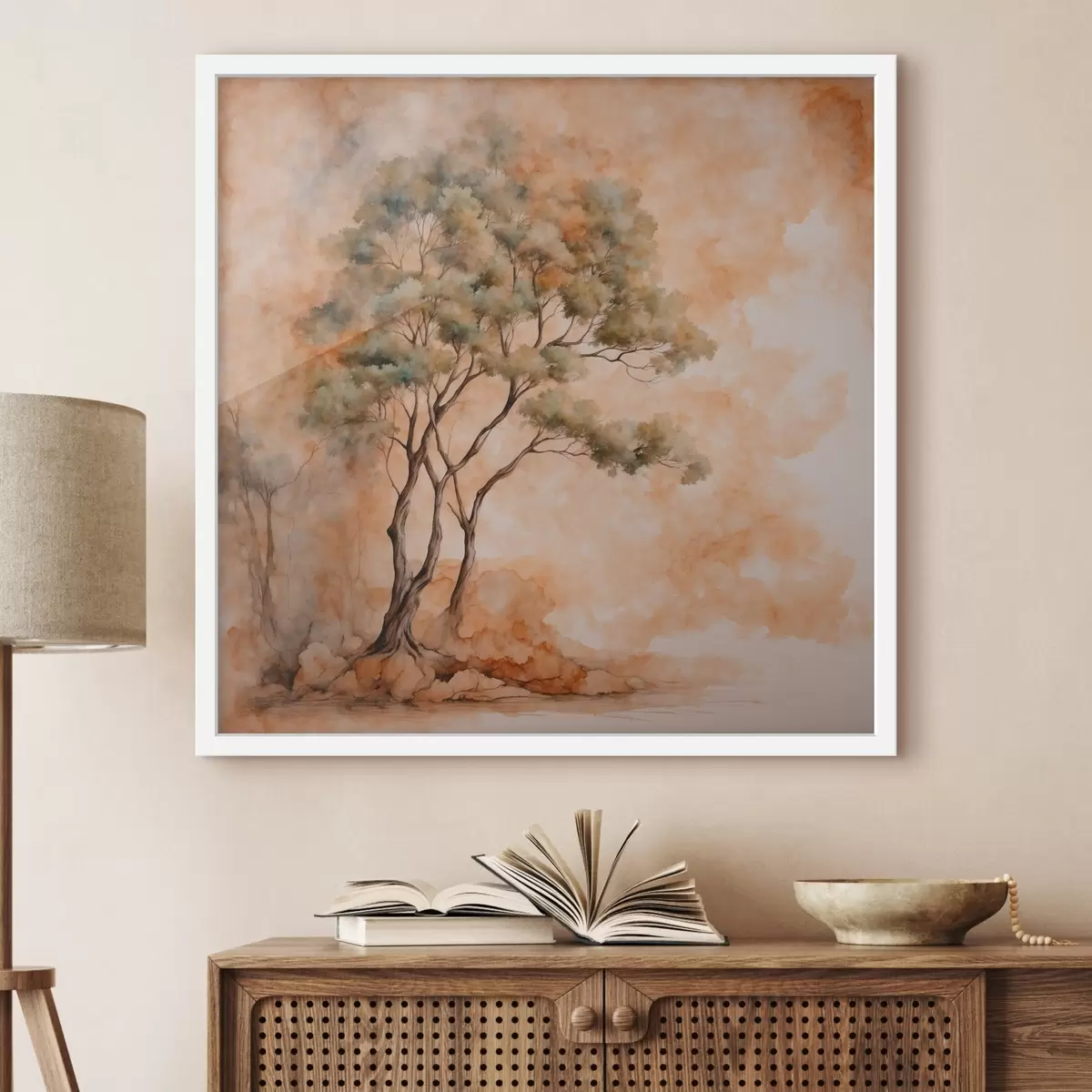 Plakāts Koks uz oranžā un baltā fona akvareļglezniecības stilā Nr f42514