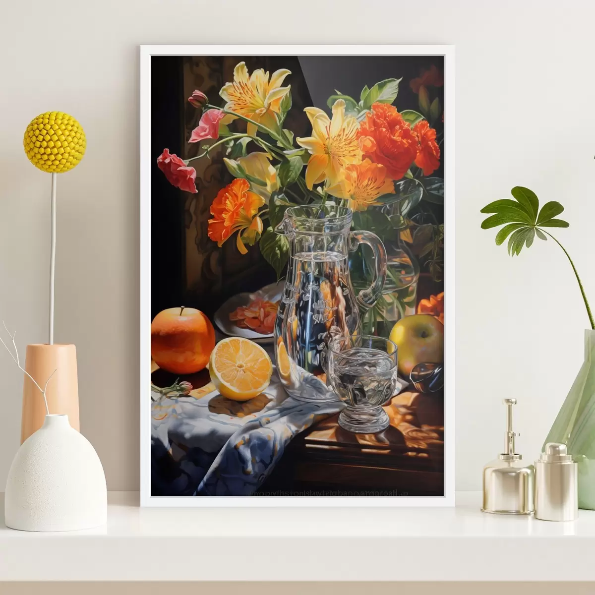 SākumlapaPlakātu katalogsPlakāti ziediPlakāts Klusā daba ar košu ziedu pušķi dzeltenos un sarkanos toņos, stikla krūzi, citrusaugļiem un āboliem uz izgaismota galda Nr f42560