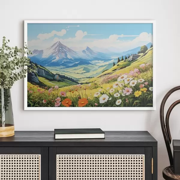 SākumlapaPlakātu katalogsPlakāti dabaPlakāts Spilgta kalnu ainava ar ziedošām pļavām, zaļiem pakalniem un majestātiskām virsotnēm zem skaidrām zilām debesīm. Nr f42565