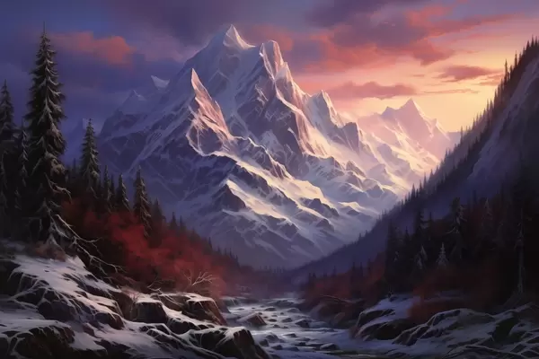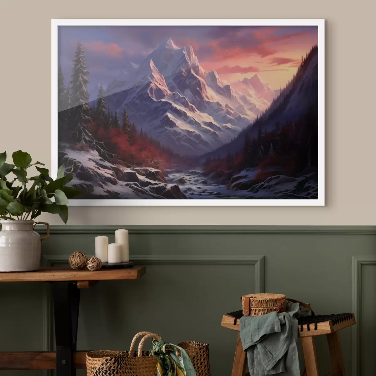 SākumlapaPlakātu katalogsPlakāti dabaPlakāts Elpu aizraujoša kalnu ainava saulrieta laikā ar sniegotām virsotnēm, tumšām priedēm un maigi sārti violetiem toņiem debesīs. Nr f42566
