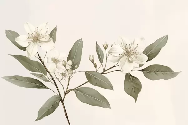 Plakāts Smalks zars ar baltiem ziediem un zaļām lapām uz gaiša fona, ar maigām detaļām un elegantu stilu. f42583