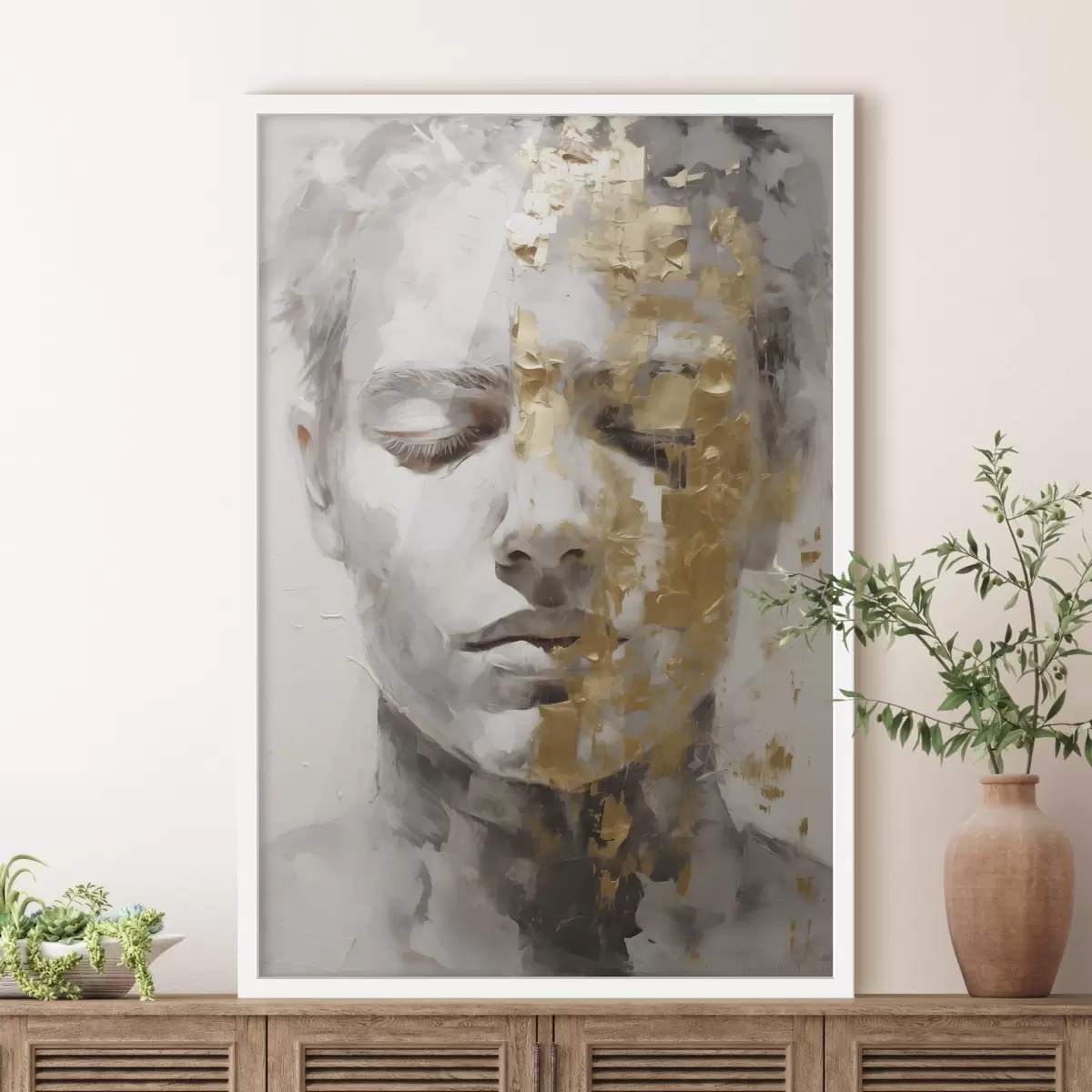 Plakāts Abstrakts portrets ar aizvērtām acīm, kas veidots gaišos toņos ar kontrastējošiem siltiem otas triepieniem, kas rada dziļu un meditatīvu noskaņu. Nr f42624