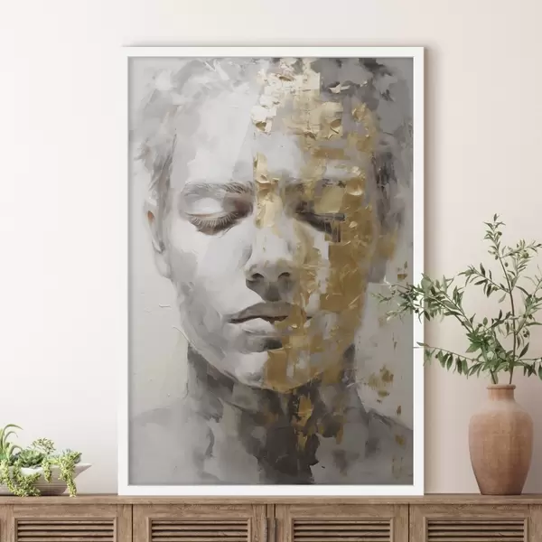 SākumlapaPlakātu katalogsPlakāti cilvēkiPlakāts Abstrakts portrets ar aizvērtām acīm, kas veidots gaišos toņos ar kontrastējošiem siltiem otas triepieniem, kas rada dziļu un meditatīvu noskaņu. Nr f42624
